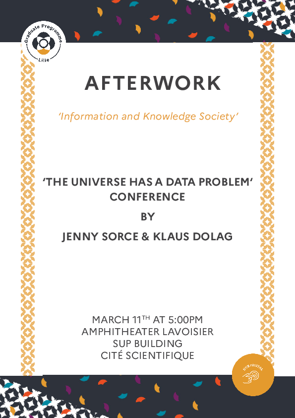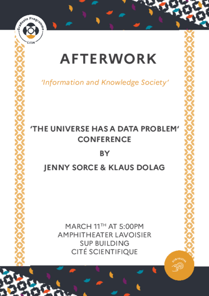 « L'univers a un problème de données », animée par Jenny Sorce et Klaus Dolag. L'événement aura lieu le mercredi 11 mars à 17 h, à l'amphithéâtre Lavoisier (bâtiment SUP, Cité Scientifique)