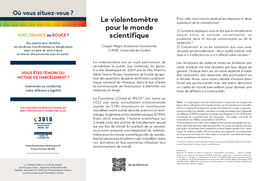 Il n'est parfois pas évident de repérer ou de légitimer des situations pour lesquelles une violence existe. Pour cela, un violentomètre adapté au monde de la recherche a été édité. Celui-ci vous permettra d'évaluer des situations auxquelles vous avez peut être été confronté.e.s. N'hésitez pas à le communiquer autour de vous, ainsi qu'à l'afficher dans votre espace de travail.